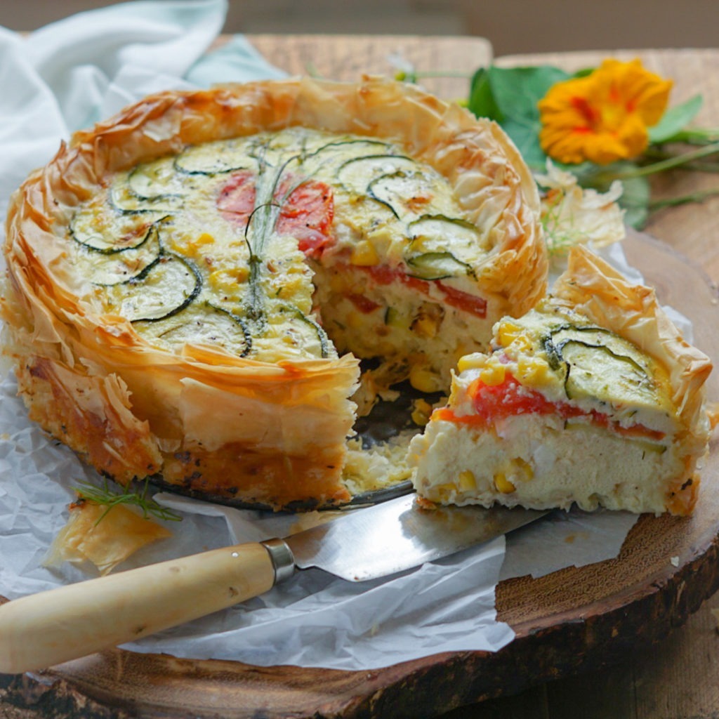 This summer quiche starts with layers and layers of golden crispy phyllo (that you don’t have to blind bake). The pastry is filled with a fluffy egg custard and you can really add anything you want to the mixture. I filled mine with zucchini, corn, tomatoes, chives and feta.